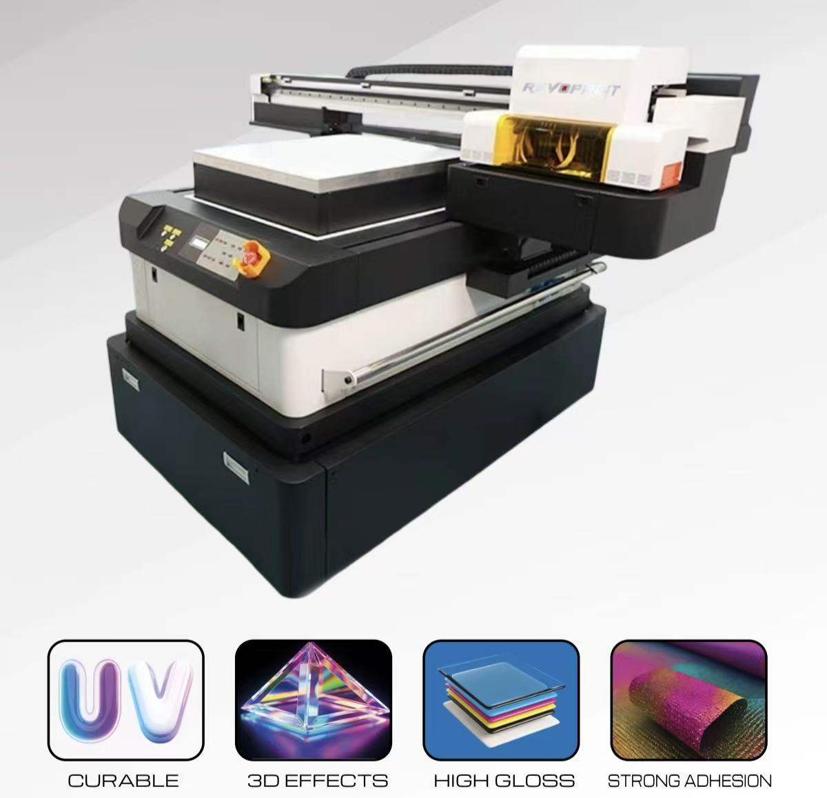 With REVOPRINT HD³ UV Technology, the printer intelligently controls ink layering and UV curing to create raised textures, crystal gloss highlights, and premium tactile finishes across a wide range of rigid and flexible materials.